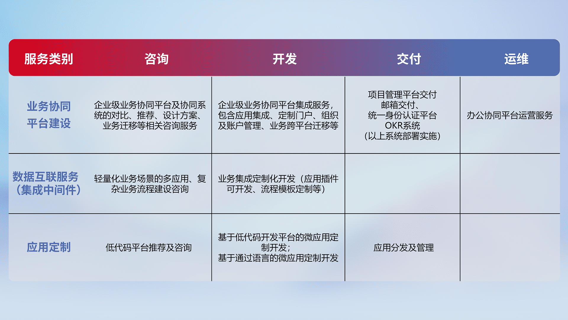 针对钉钉、、、、企微、、IDaas等平台级产品提供产品的规划、、、、方案、、、交付、、、、定制化开发等服务,,,,实现如统一协同办公、、、、智能客户服务、、混合会议管理、、、智能数据查询、、、等业务场景,,,实现数字化转型。。。