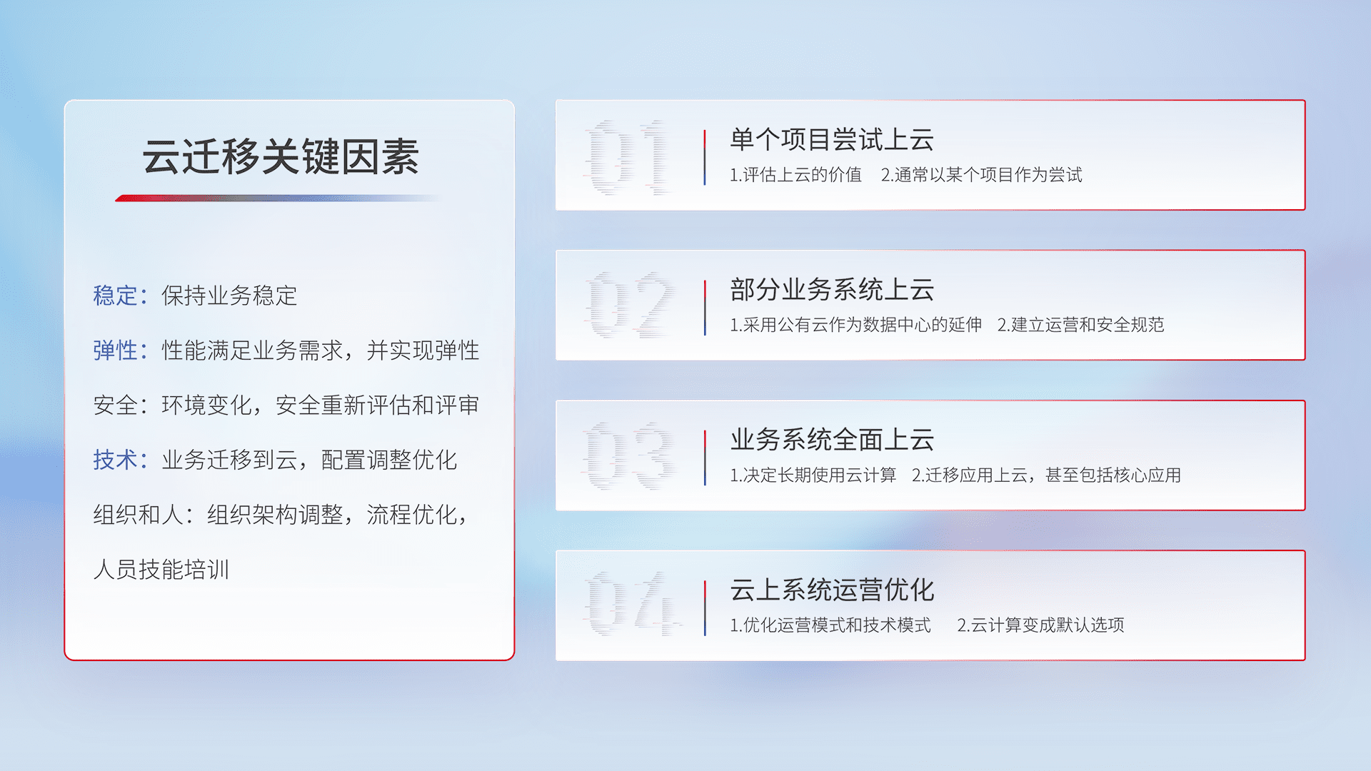 结合实际业务,,从规划设计、、云平台选型、、云原生改造、、、、数据迁移、、、、集成交付,,迁移全过程为客户识别最佳上云路径,,做好风险识别管理,,,设计网络架构、、、、身份权限、、、、安全审计合规、、操作审计、、日志审计、、监控告警策略、、、、多站点容灾设计等,,,对云上基础设施进行整体规划,,提升IT治理水平,,,,以满足弹性、、、、高可用、、、高性能的需求。。。。