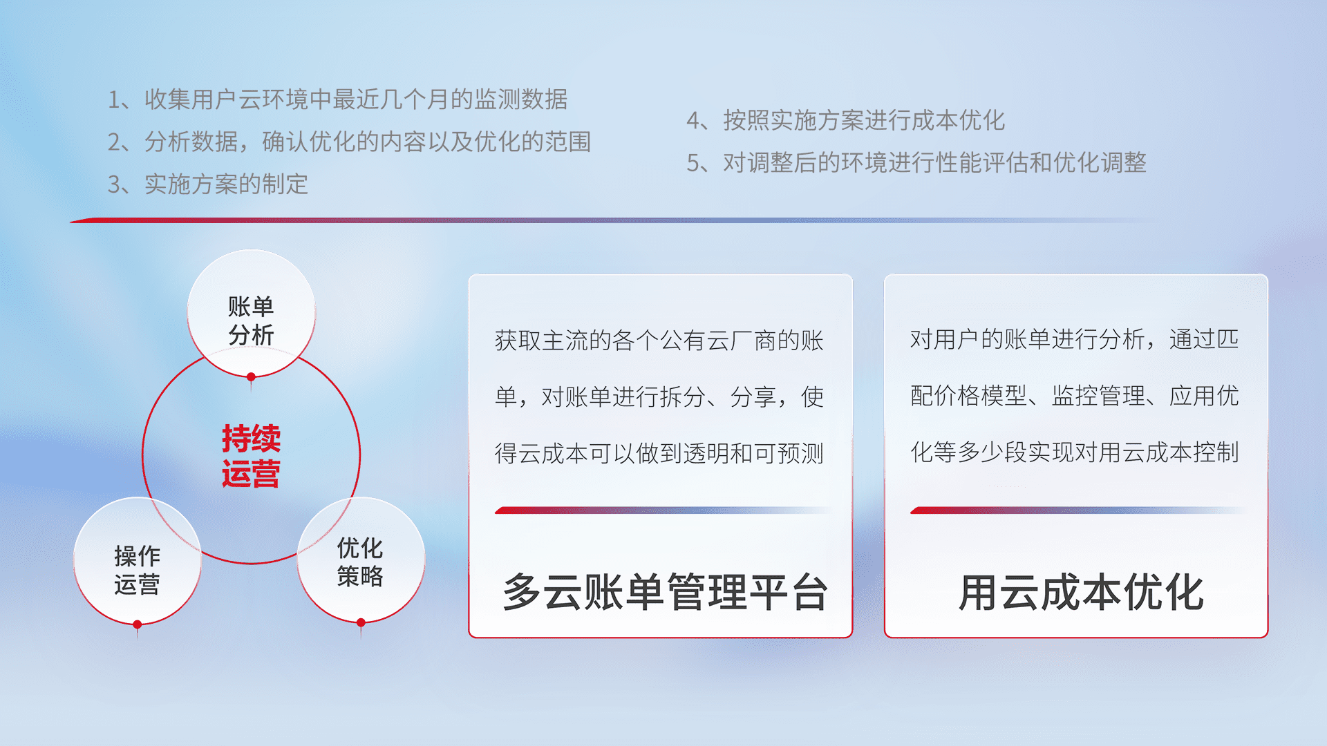 通过多云纳管,,以统一的资源数据模型把客户的云资源进行抽象和封装,,,进而实现对多云资源的统一操作,,保障云资源管理的可靠性、、、稳定性与可用性。。量身定制化运维内容,,,配置、、开发运维、、补丁管理、、、备份、、监控、、认证和访问管理、、、、审计和日常巡检等,,,保障在用云过程中的可靠度,,,,稳定度以及高可用率。。。